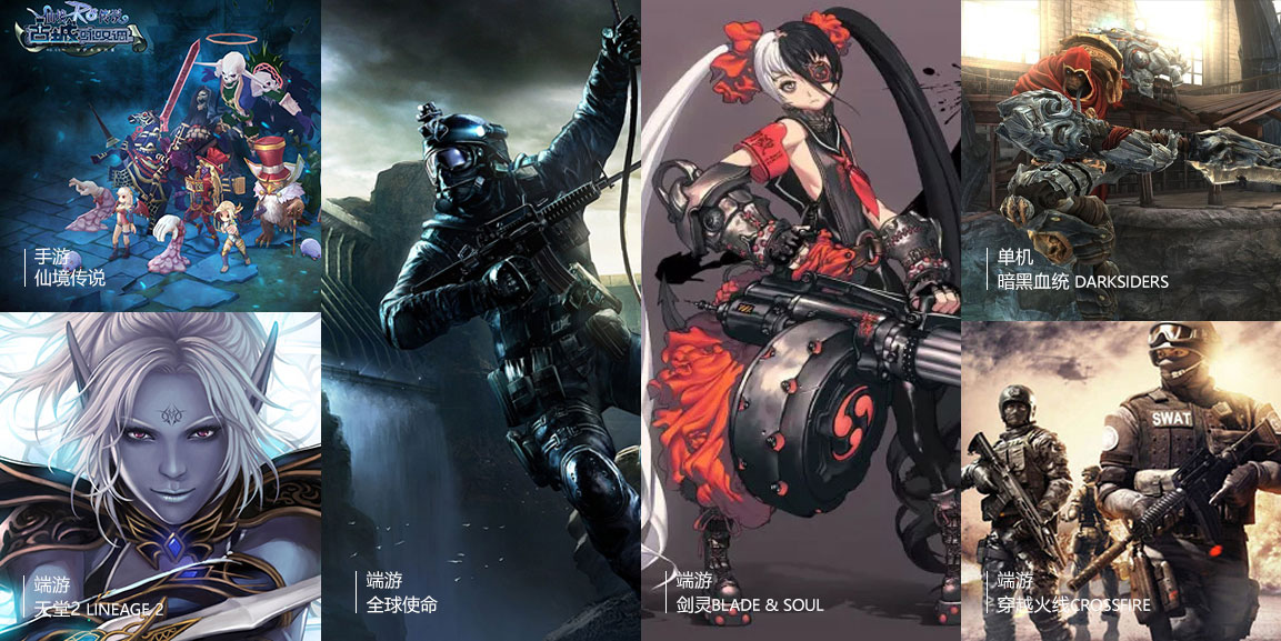 《穿越火線》、《天堂2》、《地獄之門》、《暗黑血統(tǒng)》、《全球使命》、《戰(zhàn)爭機(jī)器資料篇》、《劍靈》等項(xiàng)目。